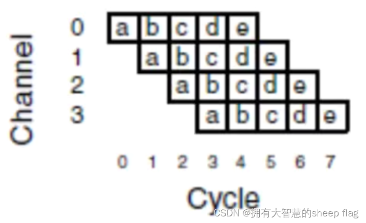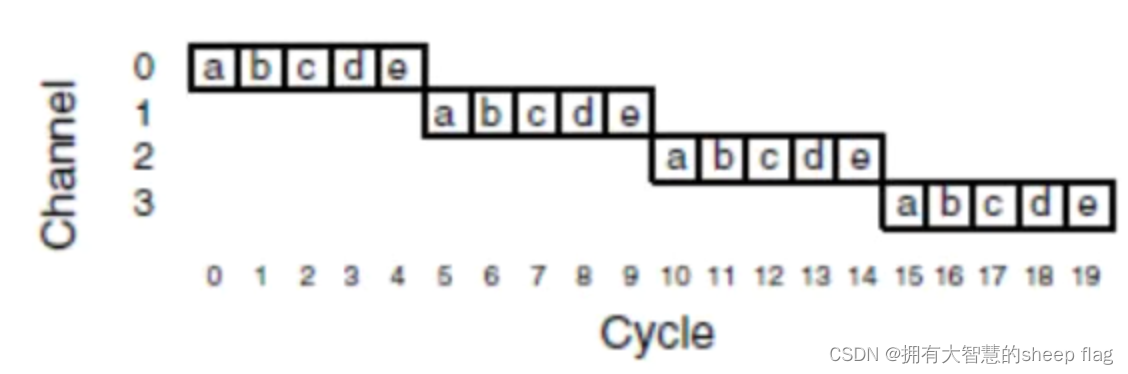 - 存储转发:每个包有5个flit(流控机制下最小数据的单元),要进入下个channel,必须将上个channel的5个flit全部收集完毕,才能到第二个通道。是个顺序的传输,延迟大,效率低。