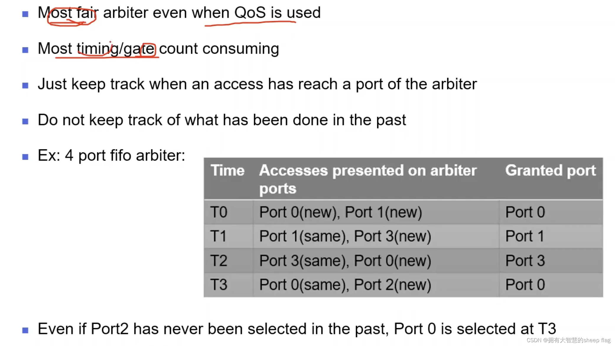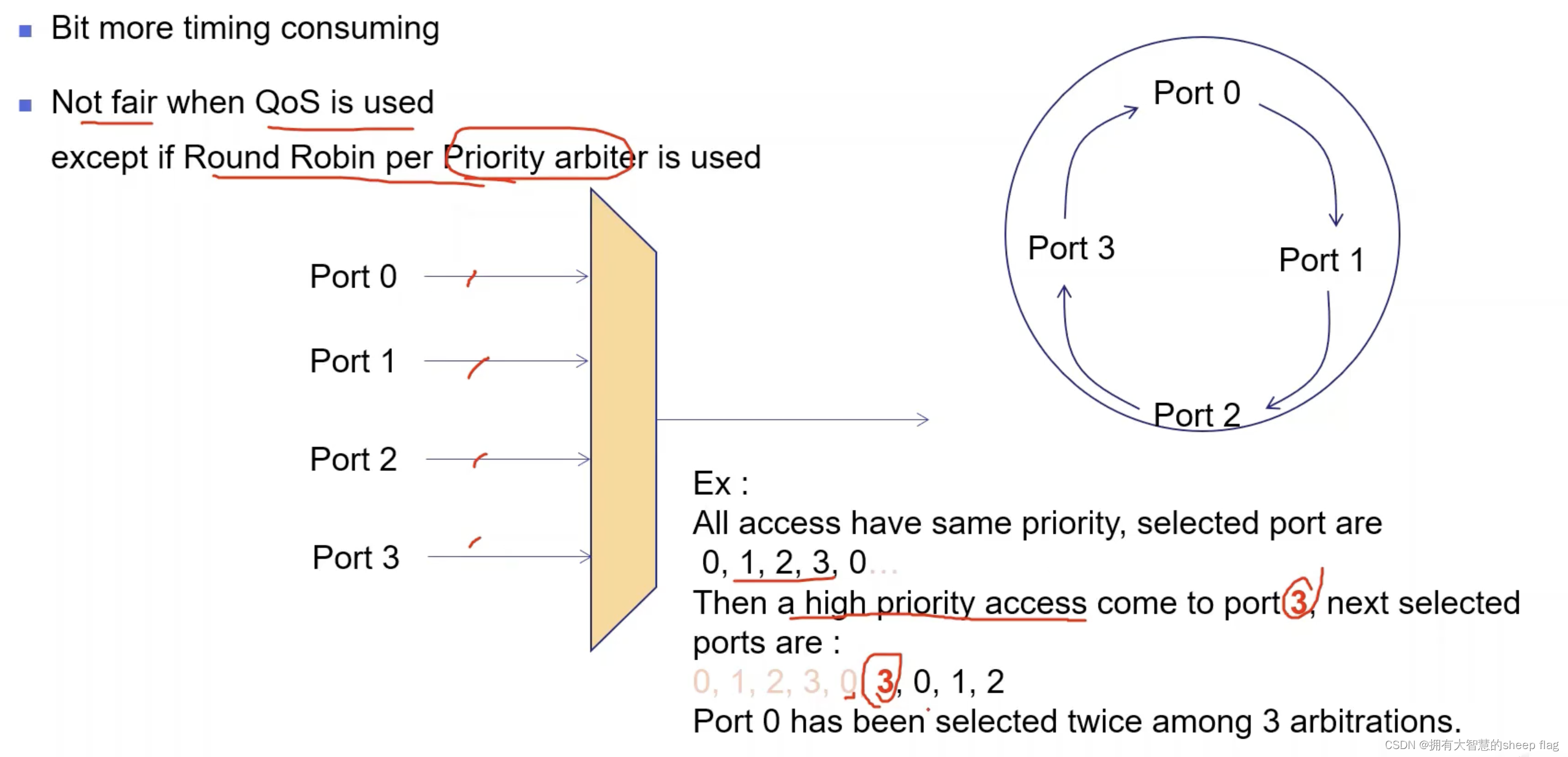 round robin结构如图所示,造成不公平的原因是当某个port存在优先级时,假如3有优先级,会造成选择为0,1,2,3,0,3,0,1,2造成不公平。