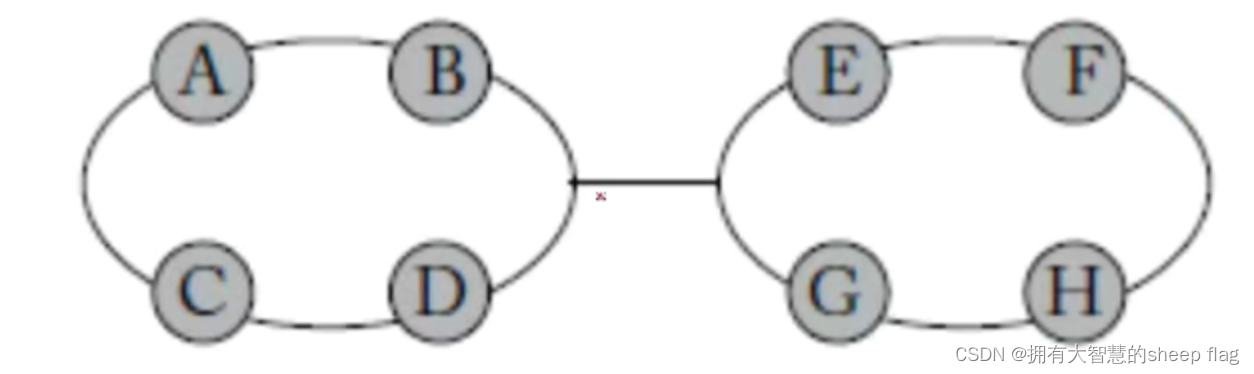 - 两条ring,中间link连接,假设网络流量均匀且随机,要计算负载就要确定瓶颈通道,可以确定为中间的link,假设是双向链路,理想路由时,对于A来说,有八分之一的概率到达任意一个节点,当目的地是ABCD时,不会穿过瓶颈通道,当到达EFGH时,流量需要经过瓶颈通道,所以节点A注入带宽的二分之一将会通过瓶颈通道,因此瓶颈通道的负载是2,相应节点最大注入带宽为二分之一,所以当网络向节点注入二分之一带宽时,整个网络就要饱和了。