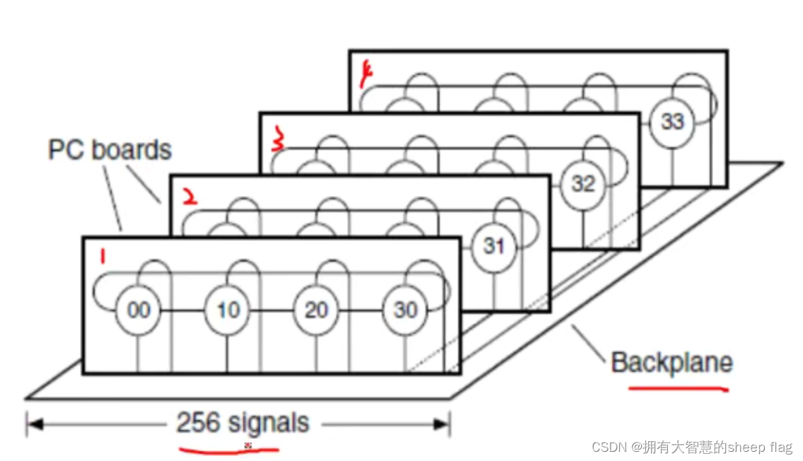 由16个nodes和8个channel组成,channel 带着packets从一个节点路由到另一个节点,每个路径的转发都是公平的竞争,下图为传输过程的示意,假设背板可以容纳256个signal,每个信号以1Gbit/s 的速率传输,那么总的二分带宽是256Gbit/s,为了使带宽饱和,那么一个节点需要传输256/16=16bit的信号宽度。