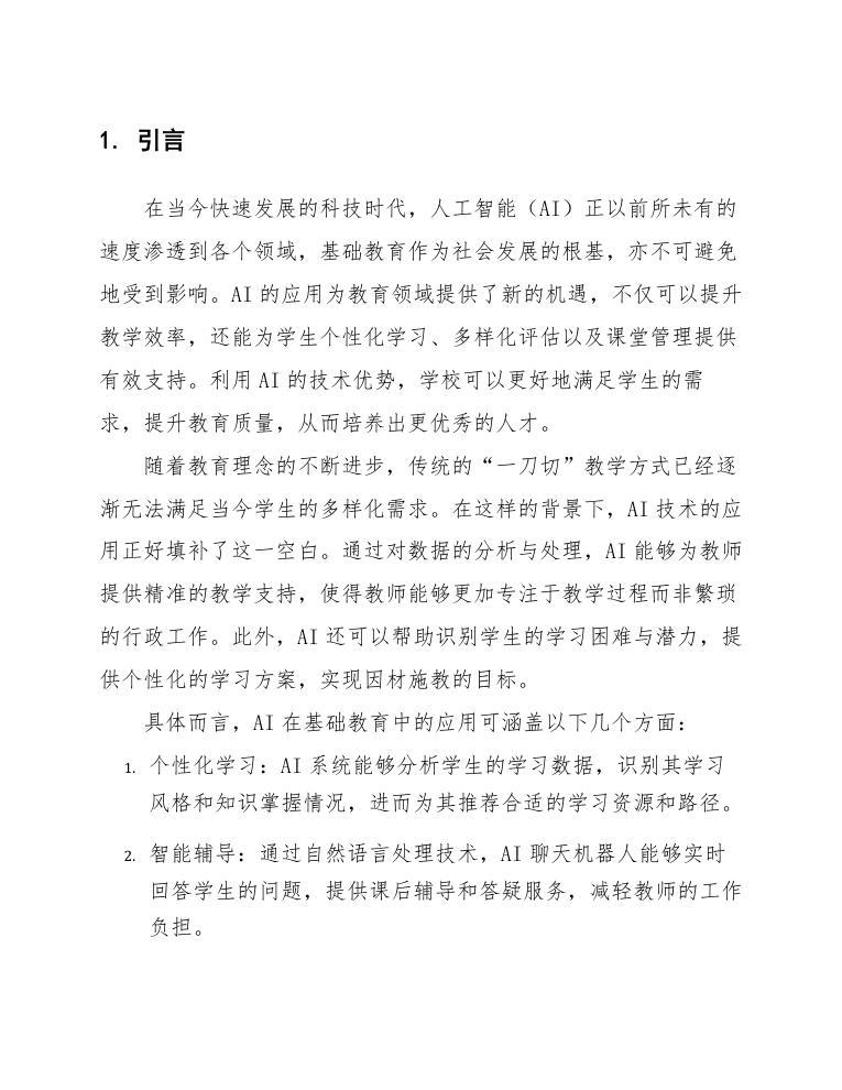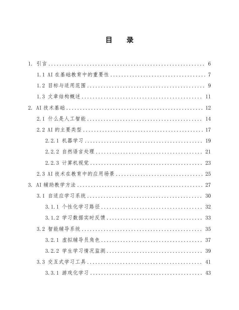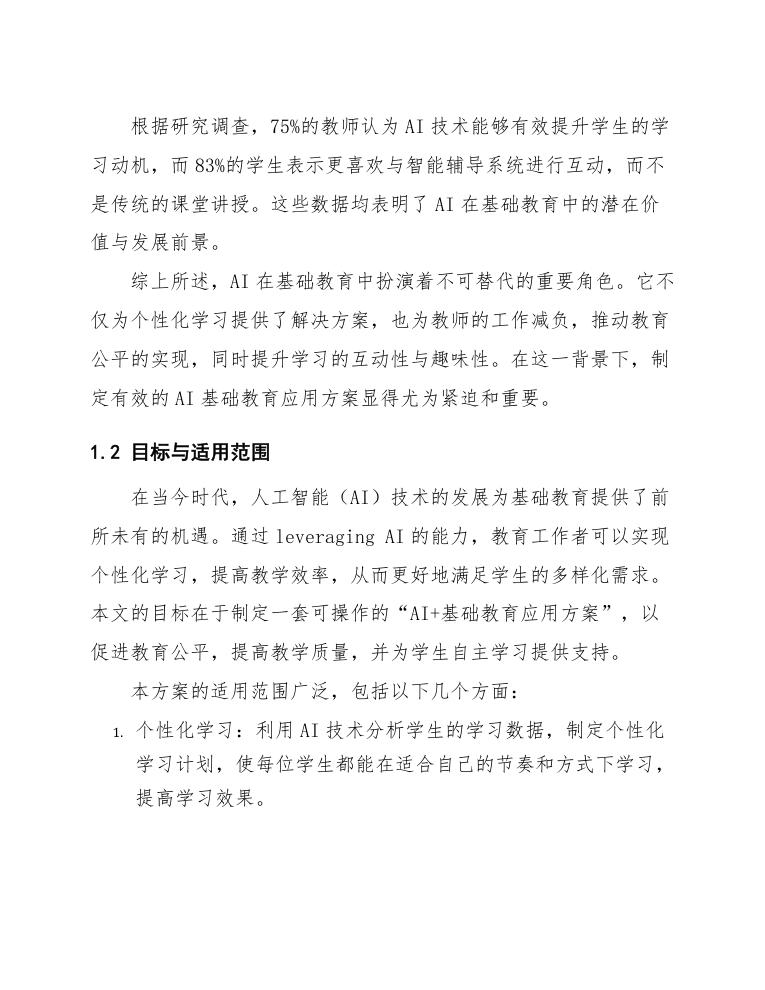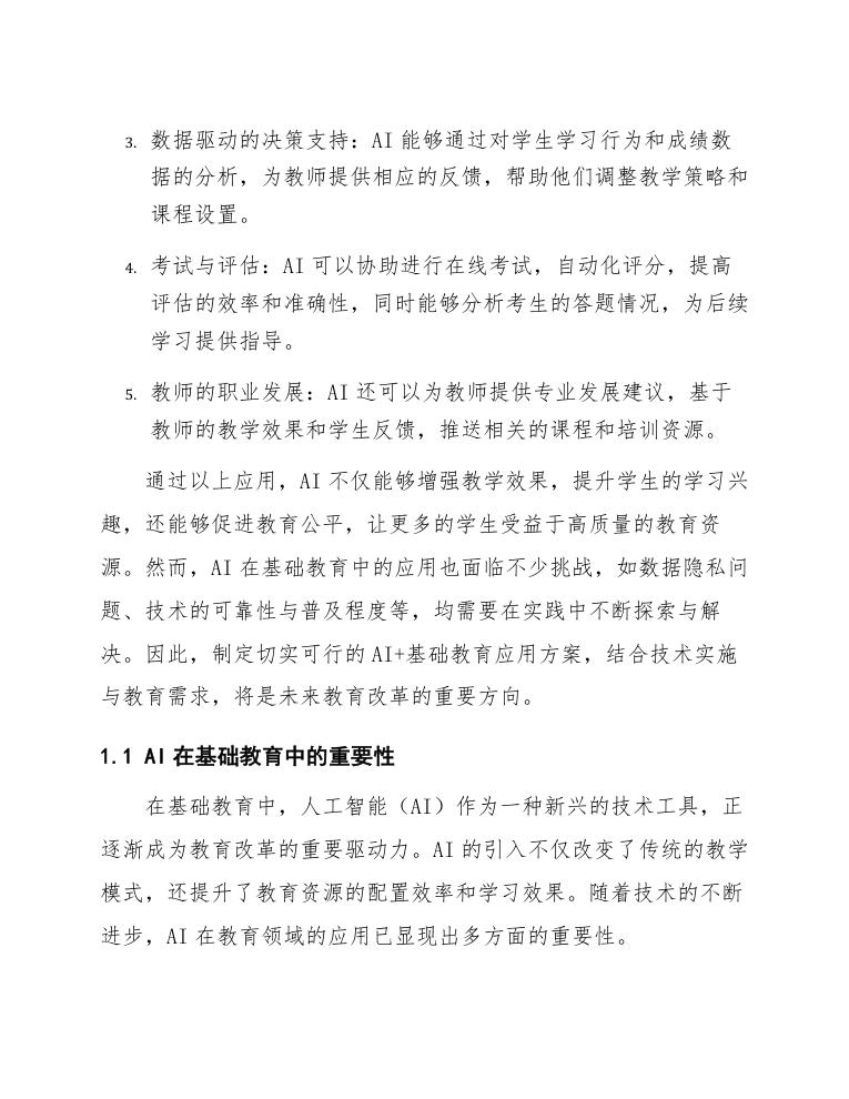 通过上述结构,本文力求全面而深入地探讨AI在基础教育的应用方案,提供切实可行的指导和参考,使教育者能够充分利用AI技术提升教学质量和学生学习体验。