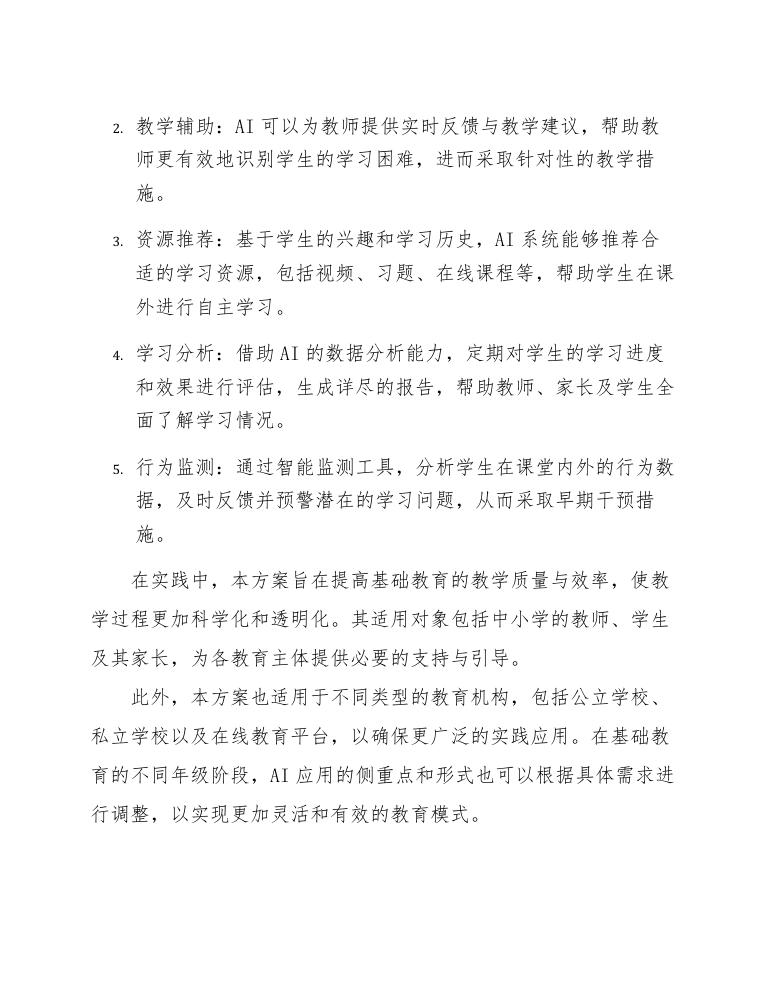 此外,本方案也适用于不同类型的教育机构,包括公立学校、私立学校以及在线教育平台,以确保更广泛的实践应用。在基础教育的不同年级阶段,AI应用的侧重点和形式也可以根据具体需求进行调整,以实现更加灵活和有效的教育模式。