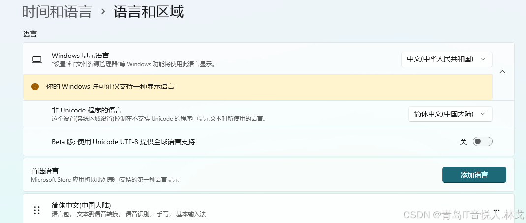 在进行了各项尝试、寻找答案后,终于在一处地方找到了解决方案,亲测有效。需要进入windows11的系统设置-》时间和语言-》语言和区域,如下图所示,将Beta版:使用Unicode UTF-8提供全球语言支持。将这项选中,看来默认就是这里没有选中导致 CMD中根本不支持UTF8,截图如下所示: