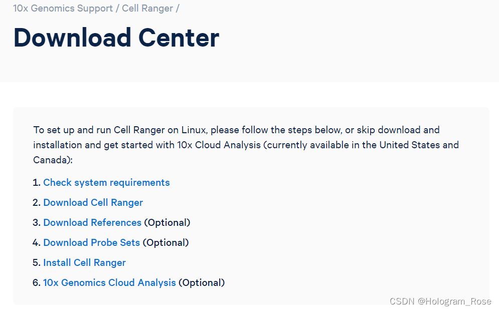进入10x软件官网Software Overview - 10x Genomics,下拉找到Cell Ranger,点击Download跳转至下载界面,该界面有Cell Ranger软件和参考基因组等资源,可以下载Cell Ranger软件压缩包上传至服务器,也可以复制这段代码在服务器下载。需注意的是,进入这些网站需要填写个人信息,包括姓名、邮箱、机构等。