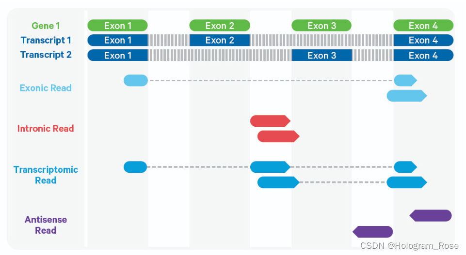 转录组比对:Cell Ranger会进一步对准确比对至外显子和内含子区域的reads进行转录本层面的注释,将reads分为外显子区(Exonic Read)和内含子区(Intronic Read),这二者都属于转录组reads(Transcriptomic Read)。而另一类反义reads(Antisense Read),则是比对至非编码区域的reads,在后续的分析中将会被过滤掉。