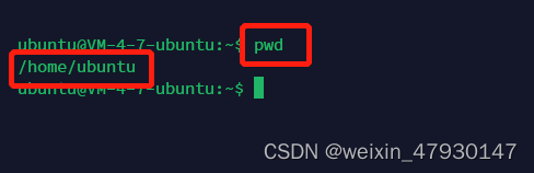 在Linux服务器上,每个账号都会对应一个自己的home目录。这个home目录被称为主目录。从上图可以看到home目录下有个ubuntu文件夹,我们通过cd命令进入该文件夹,并展示其包含的文件