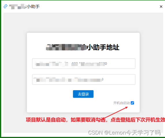 electron项目开机自启动 2、在渲染进程login.js中,获取用户操作并localStorage存储数据,保存用户的操作;4、在主进程main.js中,收到登录后的消息,自动配置是否开机自启动;5、在渲染进程login.js中,重新登录时判断是否勾选开机自启动;3、在渲染进程login.js中,在登录成功后设置是否开机自启动;1、在渲染进程login.html中,画好界面,默认勾选;一、效果展示:界面控制是否需要开机自启动。