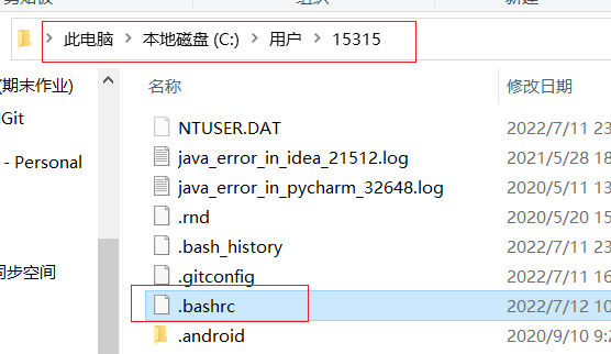 - 打开用户目录,创建 .bashrc 文件