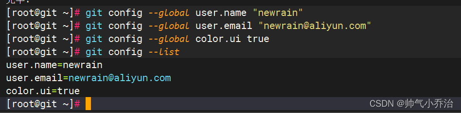 [root@gitlab ~]# git config --global user.name "newrain" #配置git使用用户 [root@gitlab ~]# git config --global user.email "newrain@aliyun.com" #配置git使用邮箱 [root@gitlab ~]# git config --global color.ui true #语法高亮 [root@gitlab ~]# git config --list # 查看全局配置 user.name=newrain user.mail=newrain@aliyun.com color.ui=true