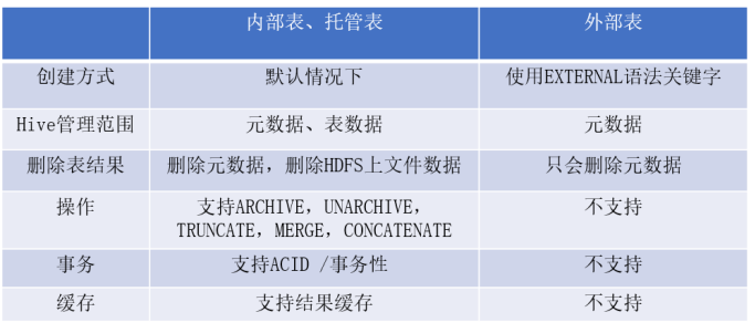 无论内部表还是外部表,Hive都在Hive Metastore中管理表定义及其分区信息。删除内部表会从Metastore中删除表元数据,还会从HDFS中删除其所有数据/文件。