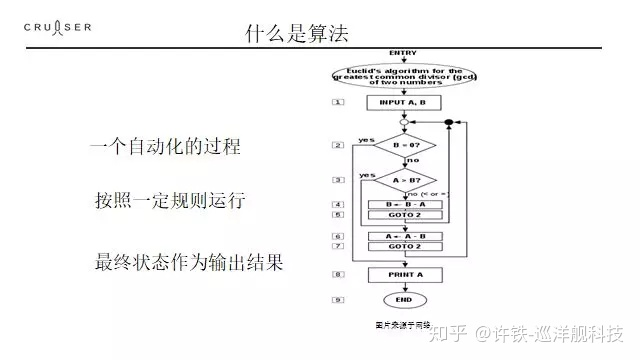 具体理解什么是算法, 一个非常典型的例子, 排序就是一个很经典的算法, 杂乱无章的数字堆在一起, 我们要一从大到小给它排列出来。然后, 我们会规定一个过程, 让这串数据进去, 然后整齐从大到小的出来,这就是一个算法。 我们可以如何做呢? 有无数种方法, 最简单的让每个数据从左到右与旁边数据比较,每次遇到比自己大的, 就右移一格, 遇到不如自己的, 就不动,这样下来, 然后那个小的继续比较, 这样最小的那个就沉到最后, 这样再对剩下的数处理, 往复循环,就可以从小到大的出来。 当然我们可以发明无数过程实现这个东西,比如插入法, 堆排序等,但是万变不离其综的是, 一个可以自动实现的过程, 每一步按照一定规则行进,得到一个我们想要的结果。我们可以看到算法是把人的逻辑过程给自动化了。