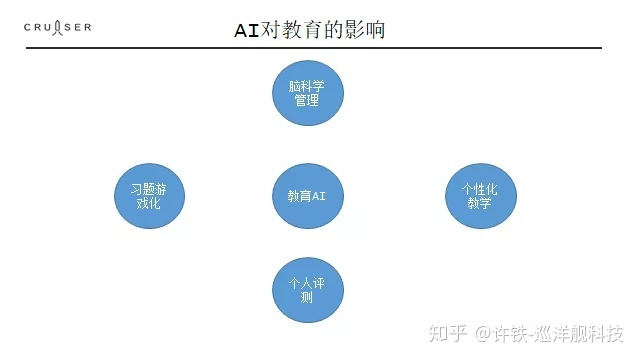 除了这些和生产生活直接相关的领域, 人工智能在一些比较“软” 的领域, 比如教育, 也会成就非凡。 AI教育其实符合我们刚刚说的所有三个条件。当下的教育产业已经非常接近互联网产业。 一方面各大在线教育机构的产品本身就是互联网发布的,另一方面, 学生也都是在网上完成注册信息等。 AI的教育产品也和互联网产品一样, 是可以从每个用户身上提取数据进化形成闭环的。