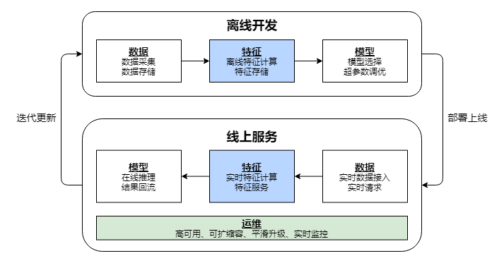 从 Figure-1 可以看到,从横向维度,机器学习全流程被划分成离线开发和线上服务两个相辅相成的流程。从纵向维度,信息价值承载的形式会经历从数据、特征、再到模型的转换过程。