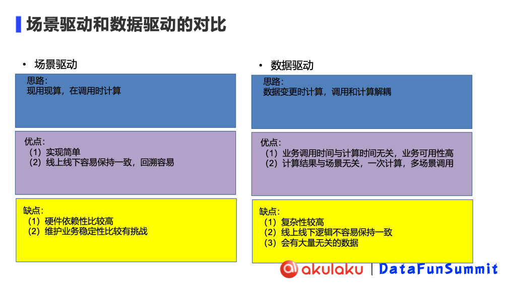 | 局限性 | 1. 硬件依赖性比较高 2. 维护业务稳定性比较有挑战 | 1. 复杂性较高 2. 线上线下逻辑不容易保持一致 3. 会有大量无头的数据 |