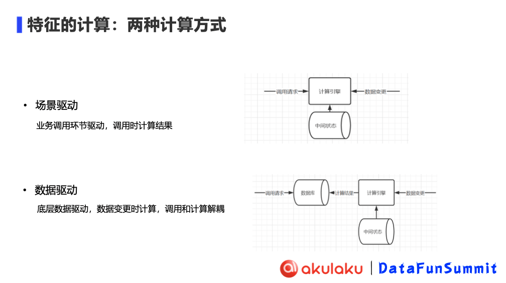 特征计算方式主要分为场景驱动和数据驱动两种。可以通过下图更直观地感受到二者的区别。