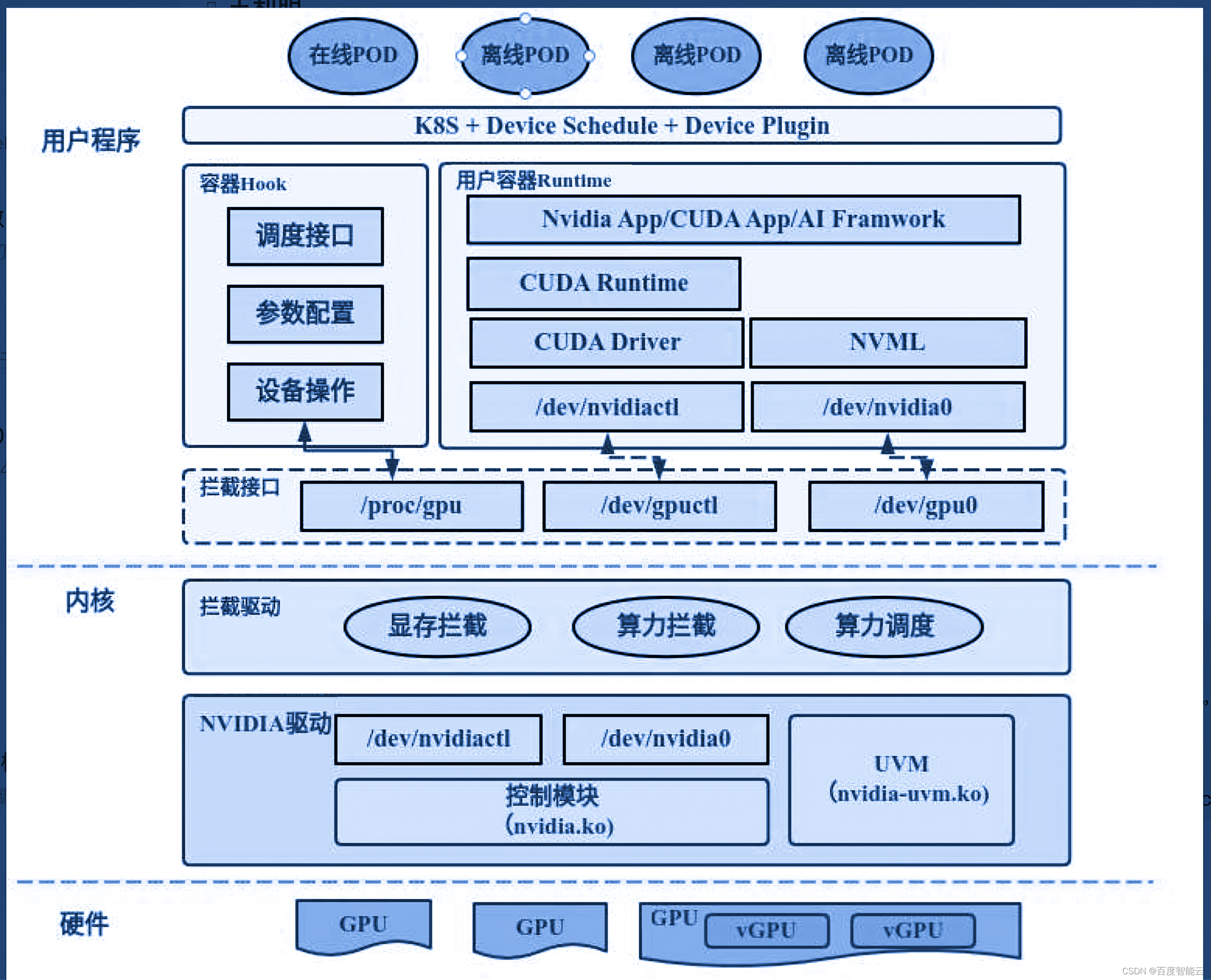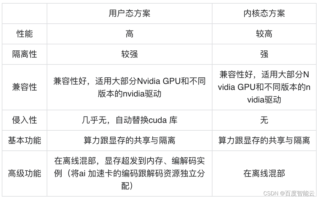 1、虚拟化:提供了用户态和内核态两种实现,用户态能够实现进程融合、显存交换、编解码实例等,性能更好;内核态隔离性强,可以实现算力隔离以及显存隔离,用户可以根据自己的需求灵活选择。用户态方案:通过拦截Driver API进行资源隔离或限制操作,实现显存隔离、算力隔离基础隔离功能及显存超发、高优抢占等高级功能。
