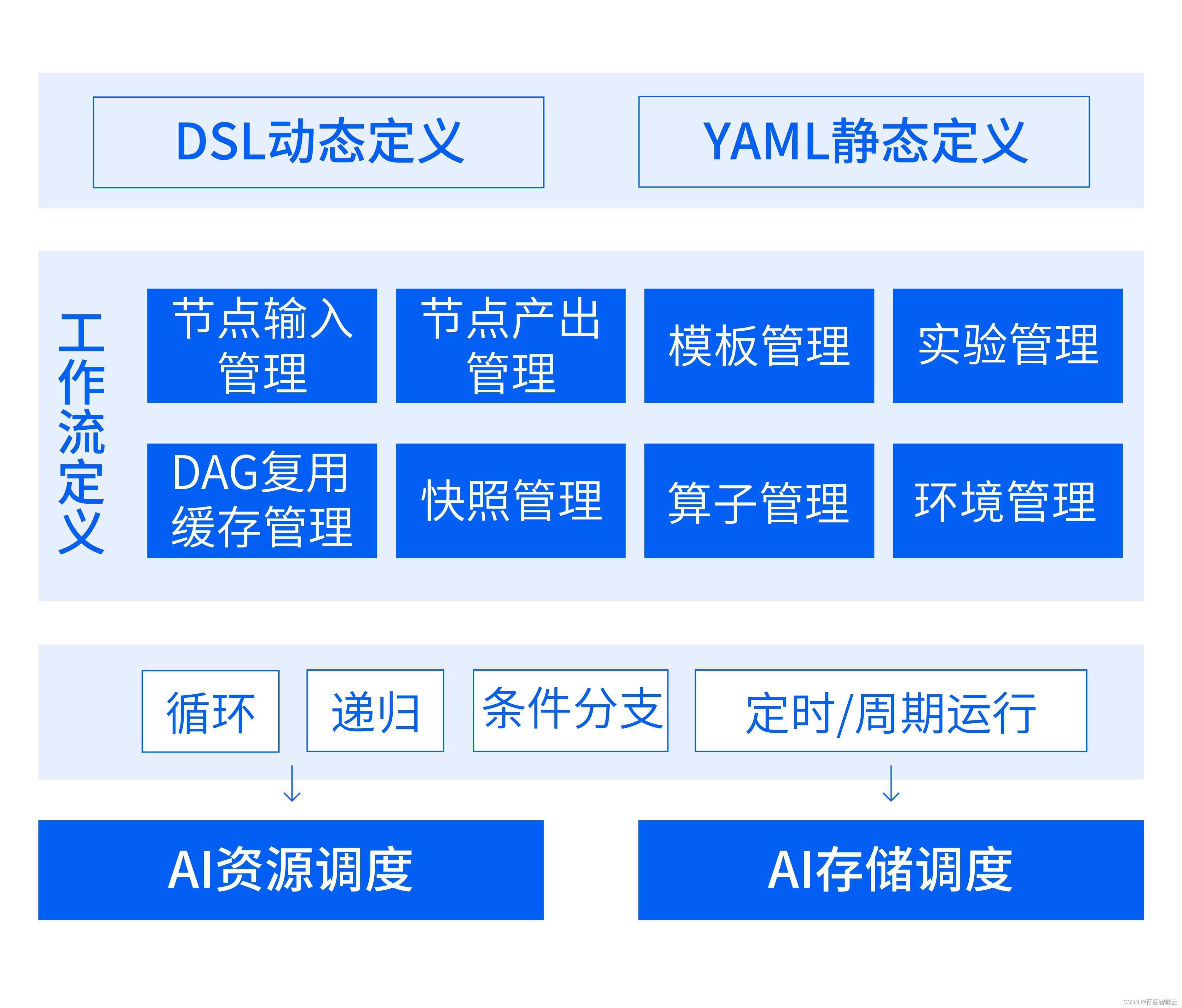 - 工作流编排:实际的AI训练过程包含数据处理、模型训练、模型评估、模型部署和发布等一系列过程,每个AI算法工作者针对每个步骤都会用自己的方式去临时管理,这样会导致代码和模型管理混乱,难以追踪和复现结果,也无法进行高效分享和代码复用。为了解决这些问题,云原生AI2.0方案集成了KubeFlow和PaddleFlow来做AI作业编排,KubeFlow作为社区的开源项目,这里不再赘述。其中,PaddleFlow定位为AI训练的最小资源内核,提供以ML/DL作业的编排为核心的工作流调度等能力,模板化作业的数据处理、训练以及部署过程,并提供Cache、Artifact管理能力使得实验过程可复用可重现。同时,对用户屏蔽多样的计算和存储类型,透明化资源管理与调度细节。