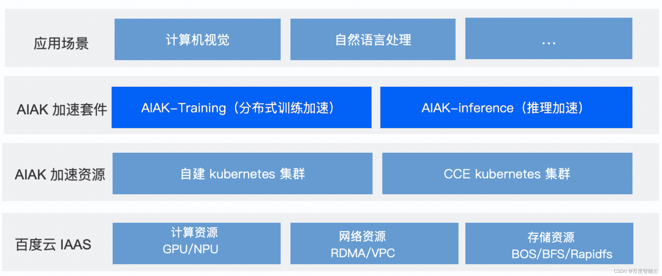 为了更好地加速训练和推理任务,在训练场景下如何实现分布式训练的加速以及数据的加速?AI镜像会有复杂的CUDA依赖,甚至会有一些驱动,镜像本身比较大,严重影响启动的速度,如何针对性进行优化?为此,云原生AI2.0方案推出了AI 加速套件 AI Accelerate Kit(简称 AIAK,本文将使用简称),该套件基于百度智能云IaaS 资源推出的AI 加速能力,用来加速 Pytorch、TensorFlow等深度学习框架的AI 应用,能极大提升分布式训练和推理的性能。