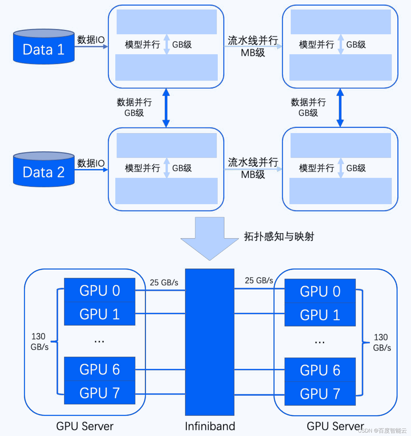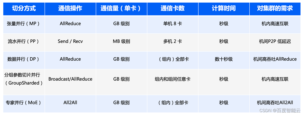 - 百度智能云自研的PaddlePaddle框架,早在2021年4月份就推出业内首创的4D混合并行策略:数据并行、张量模型并行、分组参数切片并行、流水线并行。针对性能优化和显存优化,几种并行策略都有用武之地,但也有各自的局限性,这几种策略相互组合,取长补短,能够在训练大模型时发挥各自的优势。