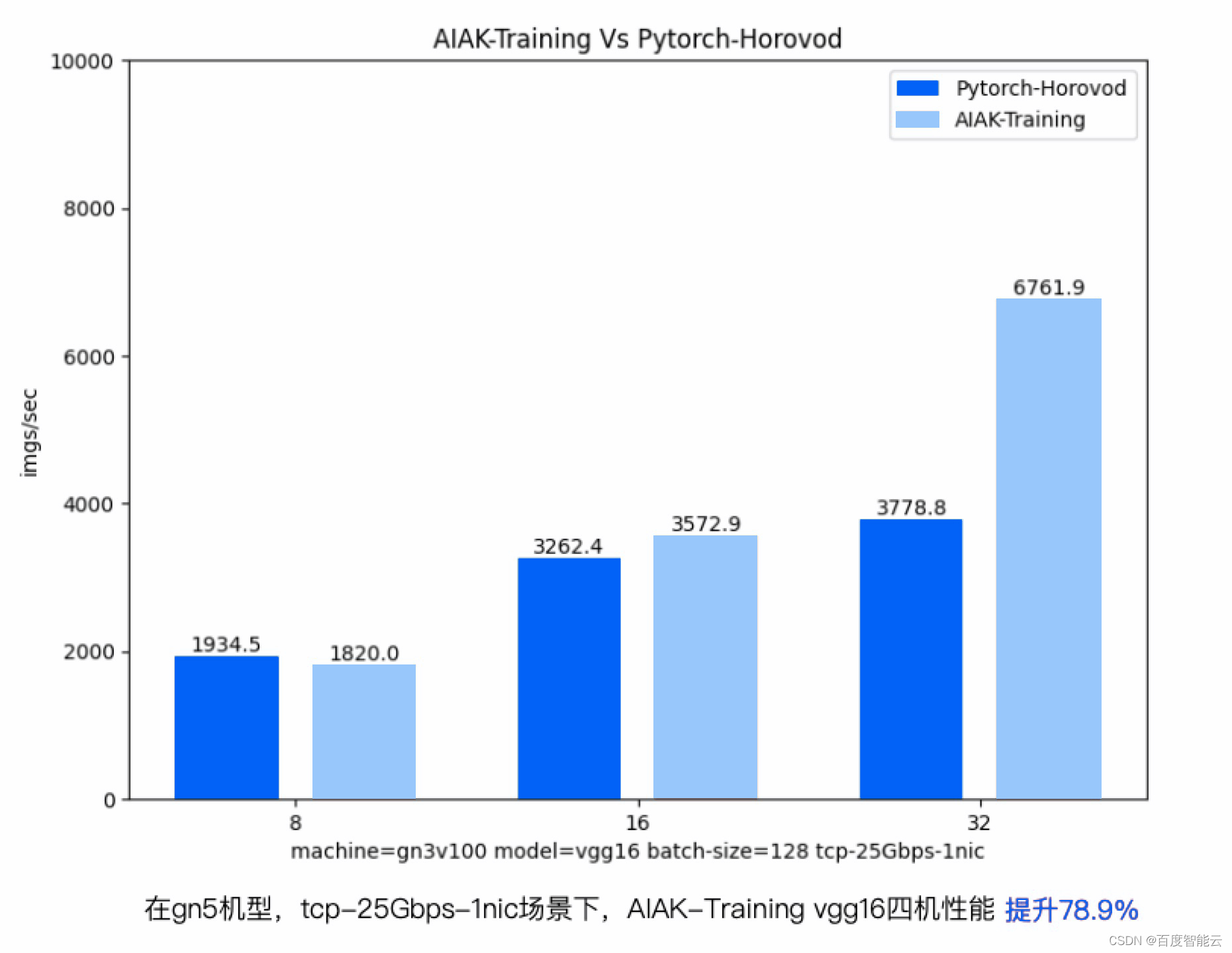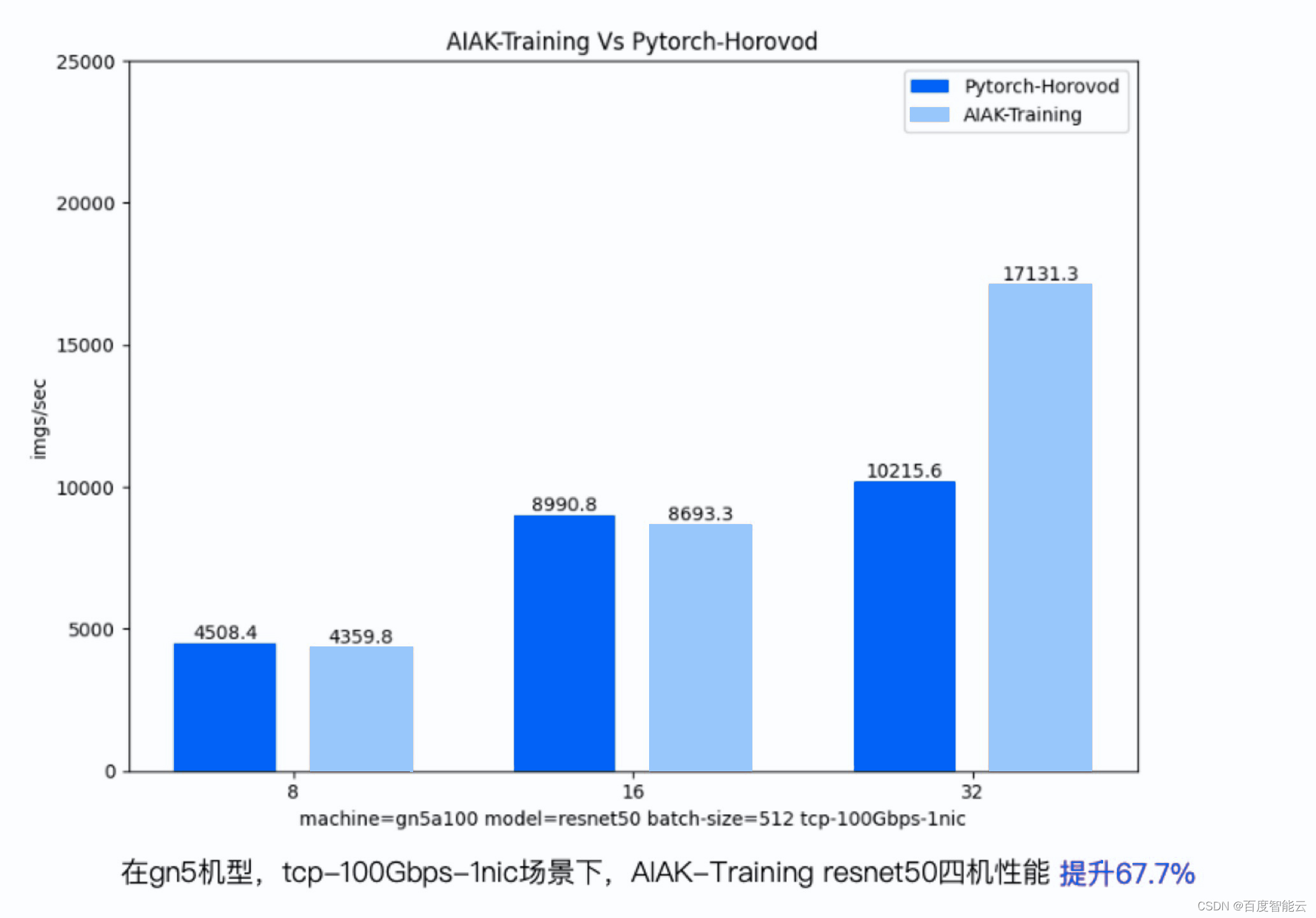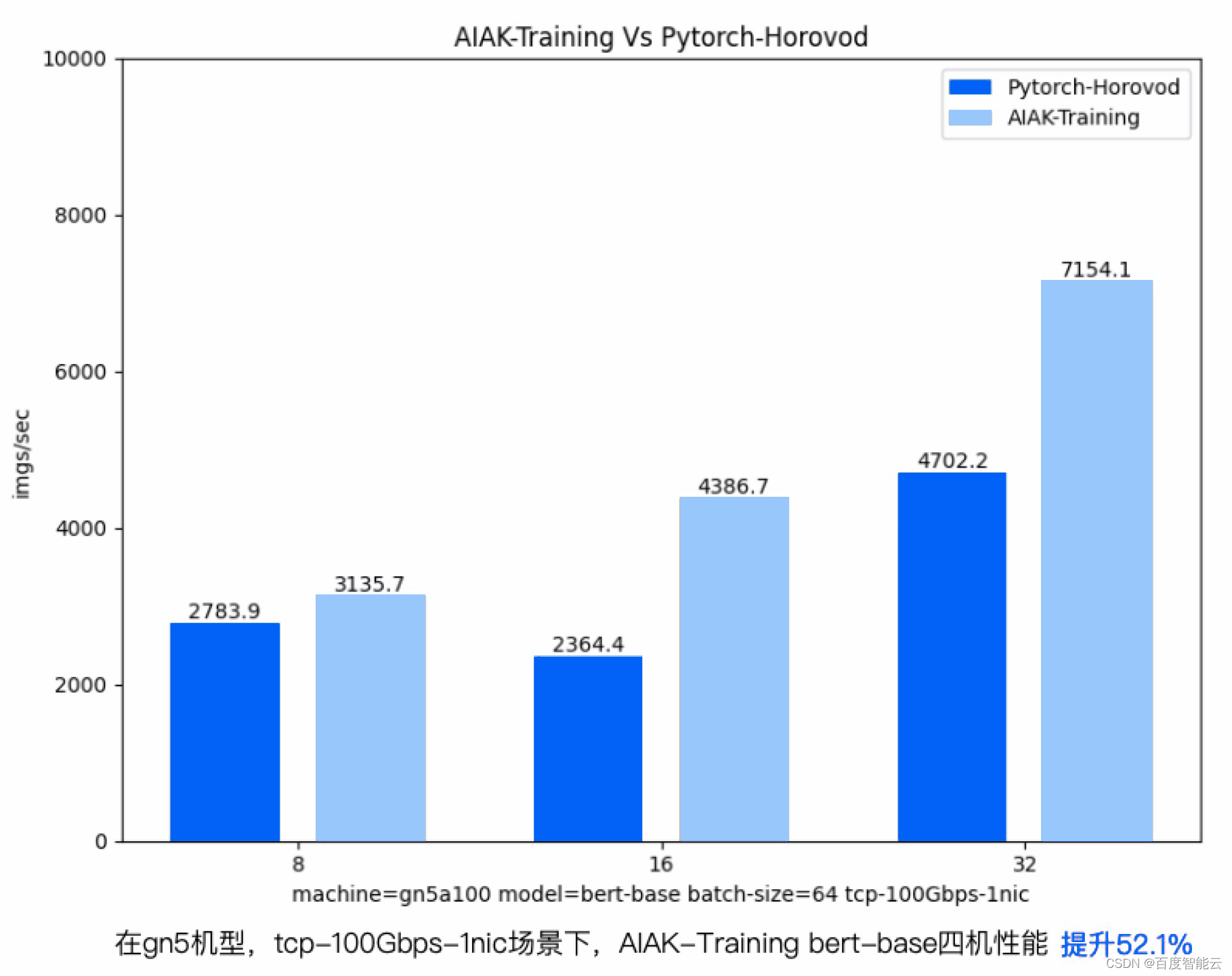 分布式训练加速:AIAK-Training 是基于 Horovod 深度定制优化的分布式训练框架(Horovod是TensorFlow、Pytorch等的分布式深度学习训练框架),在保留 Horovod 已有功能特性的基础上,增加了新的通信优化特性,完全兼容 Horovod 原有API,经典模型的训练效率提升50%以上。