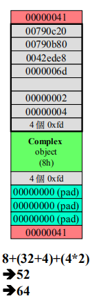 1.创建一个复数的实部虚部(2个double)得到 8 byte (绿色区域)2.调试模式下多得到 32 byte(complex上方)+4 byte(complex下方) (灰色区域)