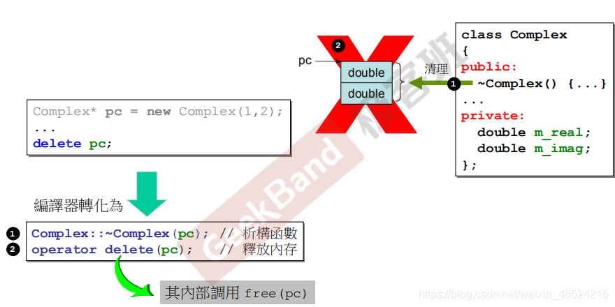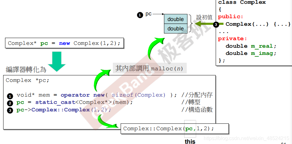 void* mem = operator new( sizeof(Complex) );//sizeof(Complex)大小为8,复数的数据类型为double(占8个字节),//operator new()其内部调用malloc(n)