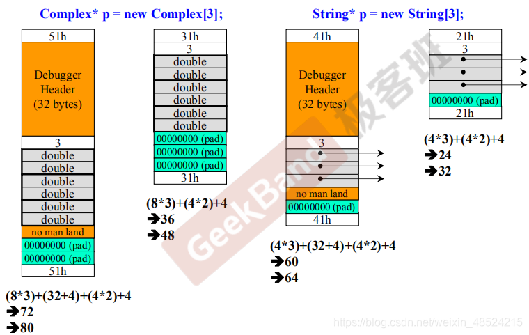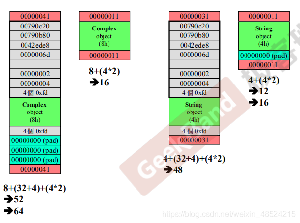1.创建一个字符串对象(字符串本身只内含一个指针,所以它的大小是指针的大小 4byte) (绿色区域)2.调试模式下多得到 32byte(complex上方)+4 byte(complex下方) (灰色区域)