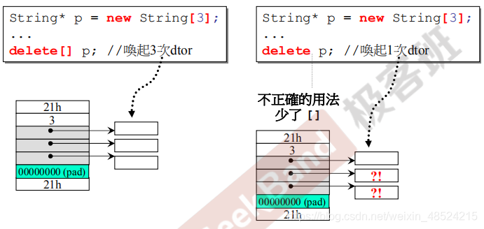 在字符串中array new 一定要搭配 array delete,像在复数中=因为它没有指针也不会做动态分配,即使你没有用array new和array delete也可以,因为复数它没有下图这种东西