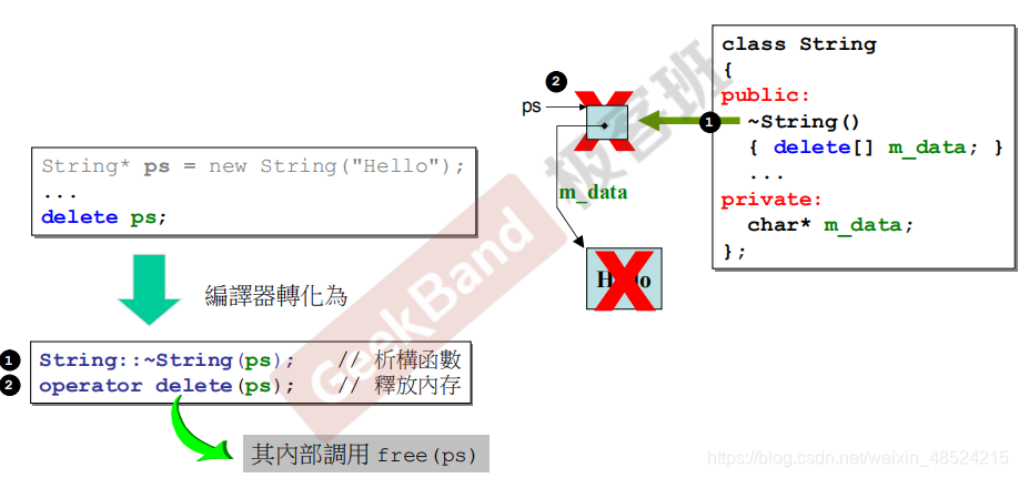 String::~String(ps);//析构函数要把动态分配的空间删掉,至于字符串本身只是一个指针