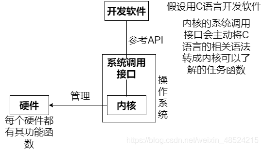 为了保护内核,并且能让程序员比较容易开发软件,操作系统除了内核程序外,通常还会提供一套API(Application Programming Interface,应用程序编程接口),那就是系统调用层