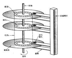 读写主要是通过机械手臂上的磁头(head)来完成,实际运行时,主轴马达让碟片转动,然后机械手臂可伸展让磁头在碟片上面进行读写的操作,由于单一碟片的容量有限,因此有的硬盘内部会有两个以上的碟片。