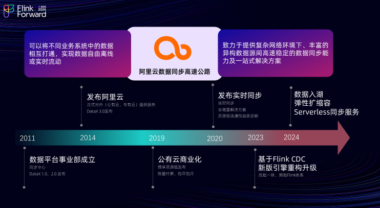 2011 年,阿里云数据平台事业部宣告成立,同年 DataX 1.0 与 2.0 版本相继发布;2014 年,阿里云DataWorks数据集成正式对外提供服务,同年 DataX 3.0 版本发布;2019 年, DataWorks数据集成在公有云上实现了商业化,推出了独享资源组服务,并提供了按量付费和包年包月两种灵活的计费方式;2020 年, DataWorks数据集成正式推出了实时同步服务,其中包括了全方位、一体化的数据集成解决方案,以及资源组网络连通性诊断工具;2023 年, DataWorks数据集成基于 Flink CDC 与 DataX 进行了新版引擎的升级,正式拥抱 Flink 体系;2024 年,DataWorks数据集成提供了数据入湖、弹性扩缩容以及 Serverless 同步服务。