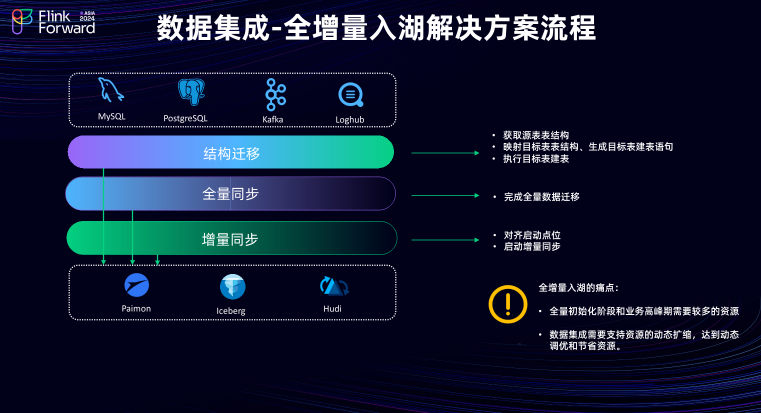 全增量入湖的过程中存在一些痛点:在全量同步阶段,由于用户可能积累了大量的数据,因此需要较多的资源来完成数据的迁移。此外在用户的业务高峰期期间也需要比较多的资源。
