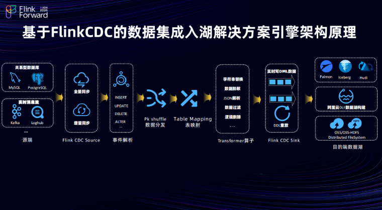 在 Flink CDC 基础上实现了包括 Paimon 、Hudi、Iceberg等多种湖格式的Sink pipeline支持,能够实现DML 数据以及DDL在目的端重放。此外在入湖场景下也支持将 Paimon 、 Hudi、Iceberg等表结构的元数据同步到阿里云的 DLF上。用户在配置入湖同步解决方案时,可以选择将元数据构建在阿里云的 DLF 上,而实际的数据存储则依托于阿里云的 OSS 或 OSS-HDFS 文件存储服务。