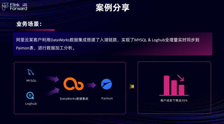 阿里云某客户利用 DataWorks 数据集成链路,成功搭建了一条入湖链路,实现了将源端 MySQL 的数据全增量同步到目的端的 Paimon表,进而进行数据加工和分析。借助 DataWorks 引擎的性能优势和弹性扩缩容架构,用户的成本最终下降了大约 50% 。