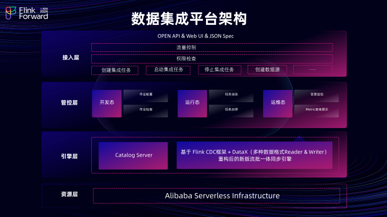 在管控层,数据集成平台会对用户创建的任务进行对应的作业检查、作业配置以及任务的启停和渲染。此外还提供了一些运维态的指标告警监控,以及 Metric查询展示功能。