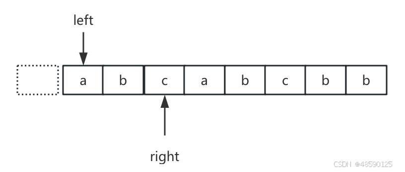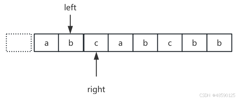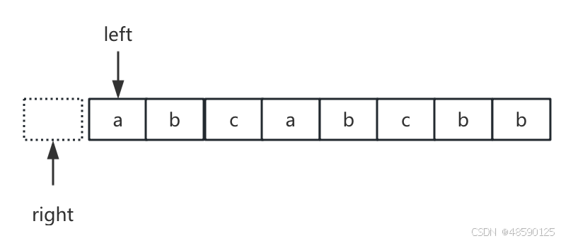 4、重复以上2轮步骤,移动right找到右边界,然后再移动left,缩小边界,再移动right,扩大右边界,循环一直到结束,记录最大的子串长度。