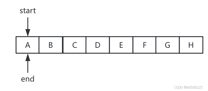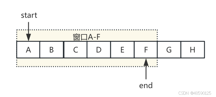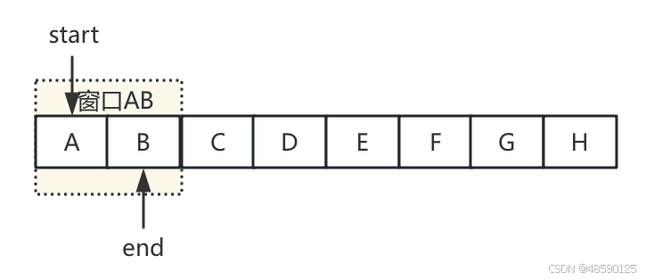 1、维护2个指针start和end,同时指向A。start和end为窗口的边界。