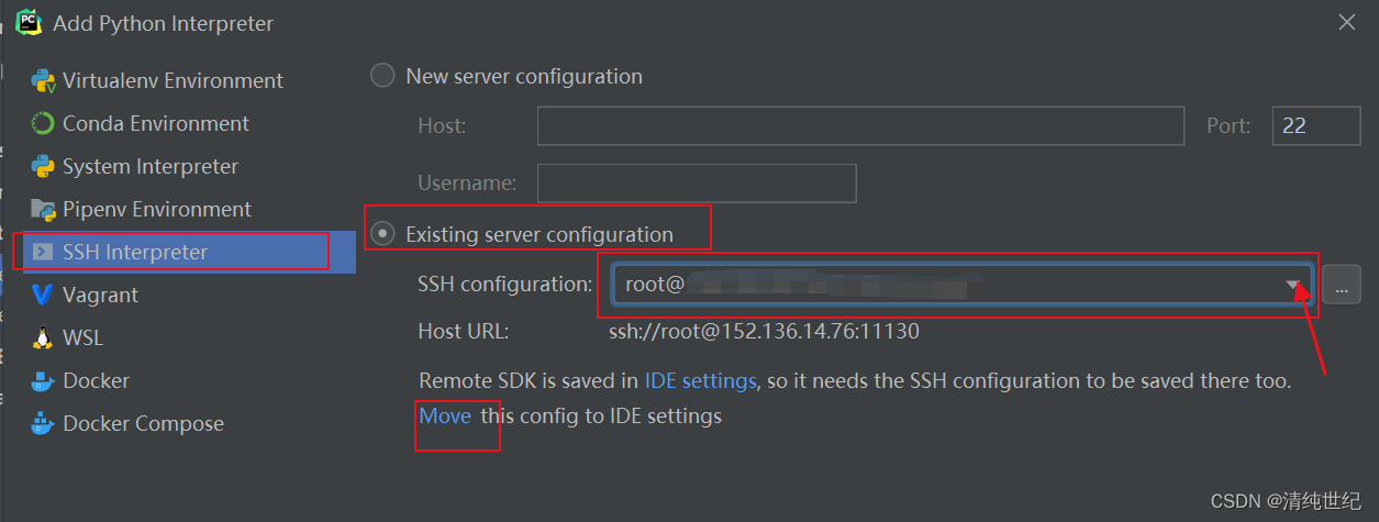 (2)选择SSH解释器,选择SSH配置,选中前面设置的服务器连接,然后点击Move->Next即可: