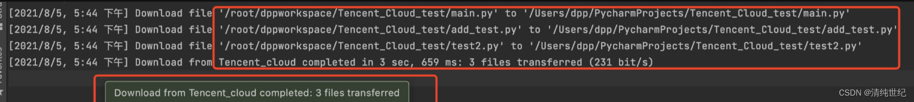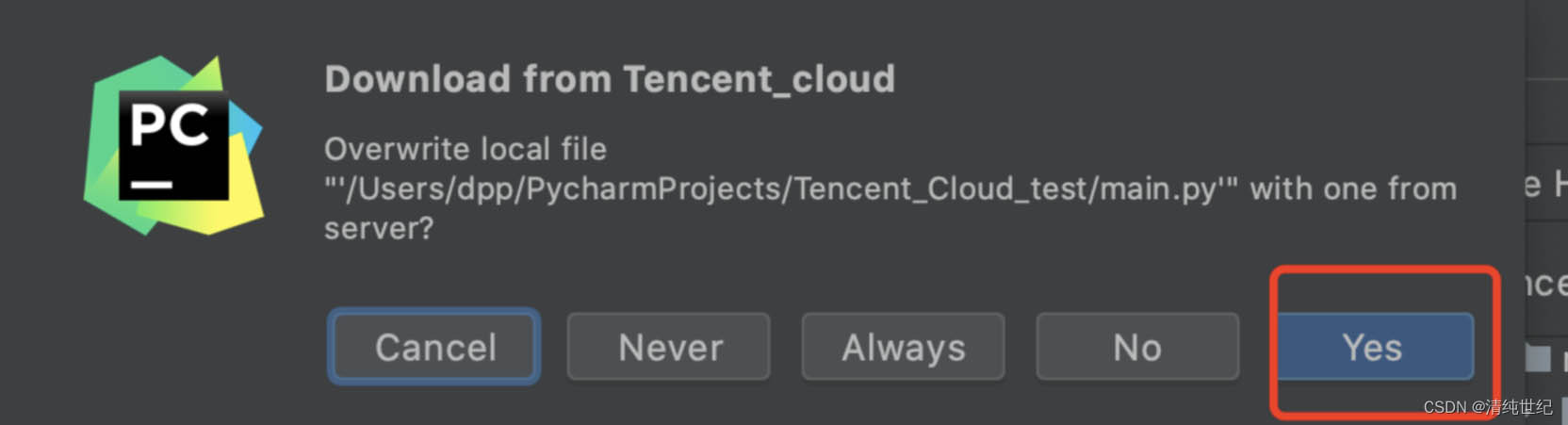在弹出的“Download from Tencent_cloud”选择“yes”或者“Always”,下载成功之后PyCharm左下角的File Transer界面会显示文件同步成功,以及文件的详细信息。