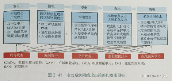 现代电力系统以及综合能源系统已不再是传统意义上的电力设备网络,而是演进成为信息与物理深度耦合的信息物理系统。系统的薄弱环节也不再局限于物理子系统,信息环节或将成为新的软肋。图3-41给出了针对电力系统发、输、配、用、变等各环节的攻击方法和攻击目标。