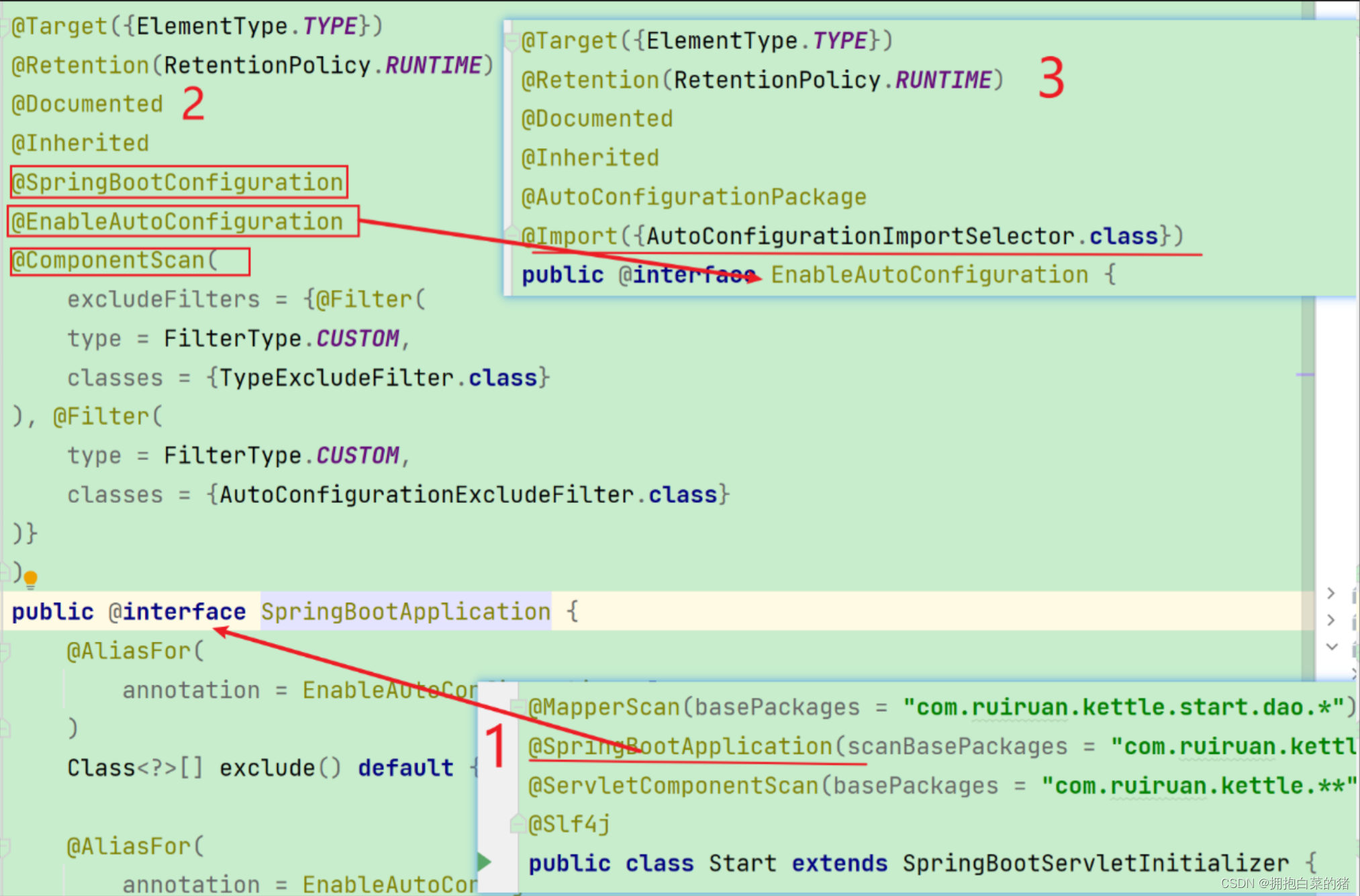 - 启动类上的@SpringbootApplication 注解的构成中由这三个注解——@SpringBootConfiguration(指定引导类也是配置类) @EnableAutoConfiguration(开启自动装配功能) @ComponentScan(扫描包,默认扫描路径为引导类所在包及其子包)