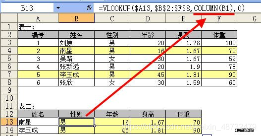 有时需要返回多列数据,方便起见可以嵌套COLUMN函数,这里从网上找了一个例子。这里的B1表示性别列在查找范围的第二列,向右拖动填充柄,可以进一步查找到年龄、身高及体重。