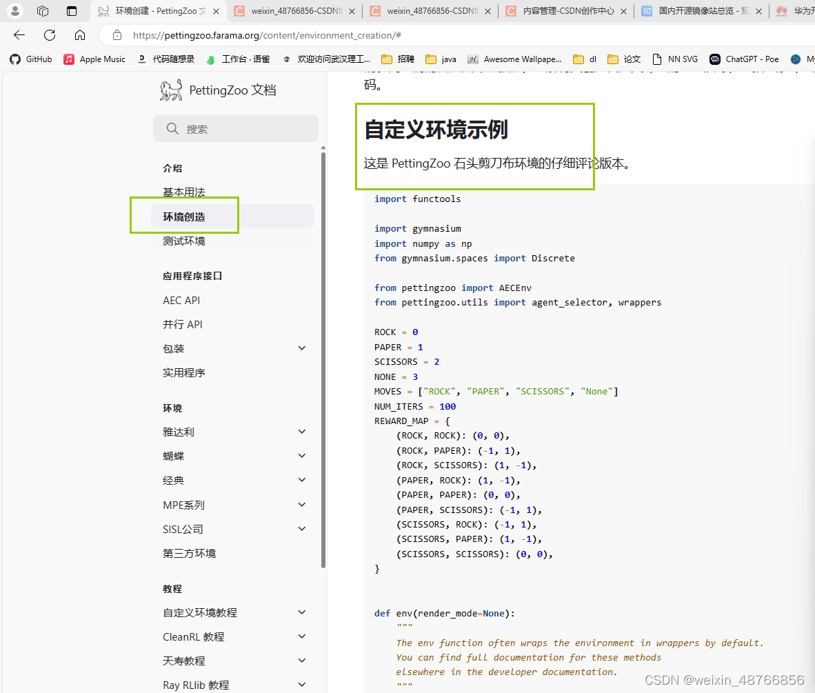也即把“ agent_selector(self.agents)”更正为“ agent_selector.agent_selector(self.agents)”,即可正确运行。方法一:新建一个名为“aec_rps”的py文件,粘贴“自定义环境”这部分代码,以供另一个粘贴了“交互代码”的demo文件使用。,故“自定义环境代码”即为所需的“aec_rps”库这一猜测的可能性变得更大,故进行尝试。,并在地址里面搜索“aec_rps”仍无结果,说明该库并不在这几个镜像里。,发现一句“若与自定义环境交互,…