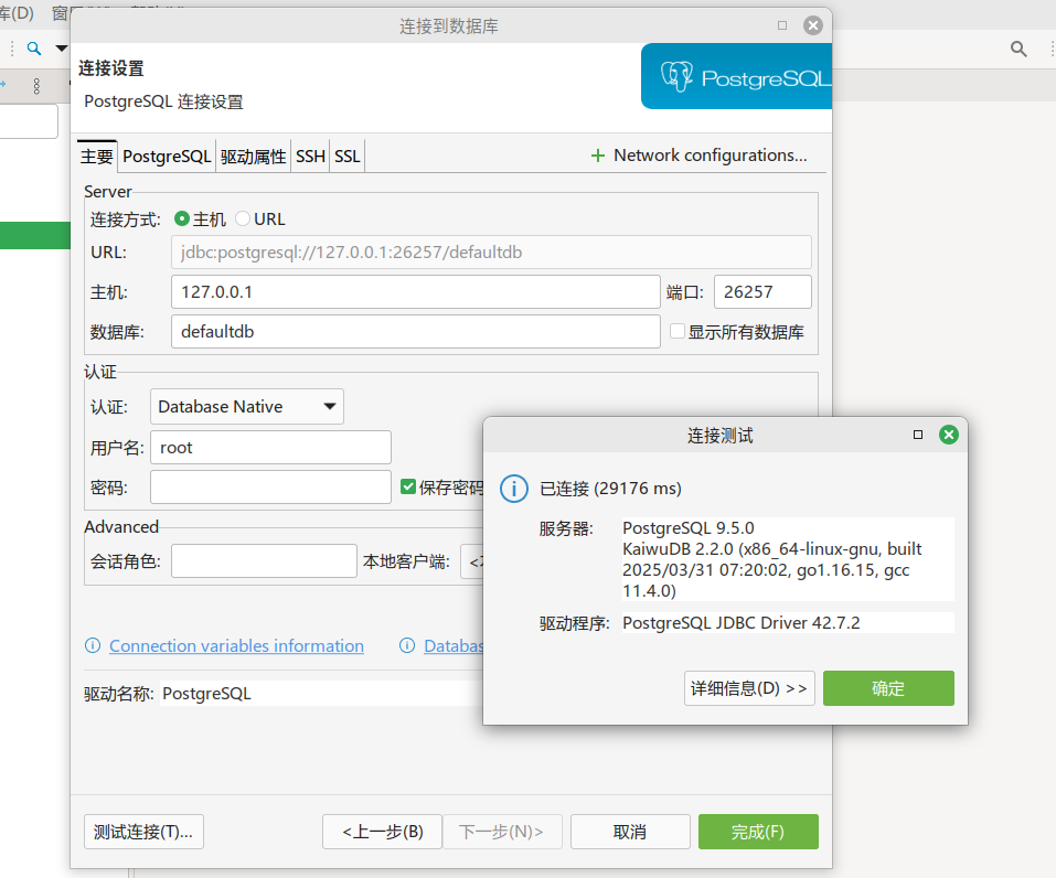 设置主机为本机127.0.0.1,端口为26257,数据库为defaultdb,用户名为root,密码为空(非安全模式),测试链接后可能需要下载驱动,下载完成再点击测试连接,弹出成功连接到kuaiwudb提示就OK了。点击确定到下一步
