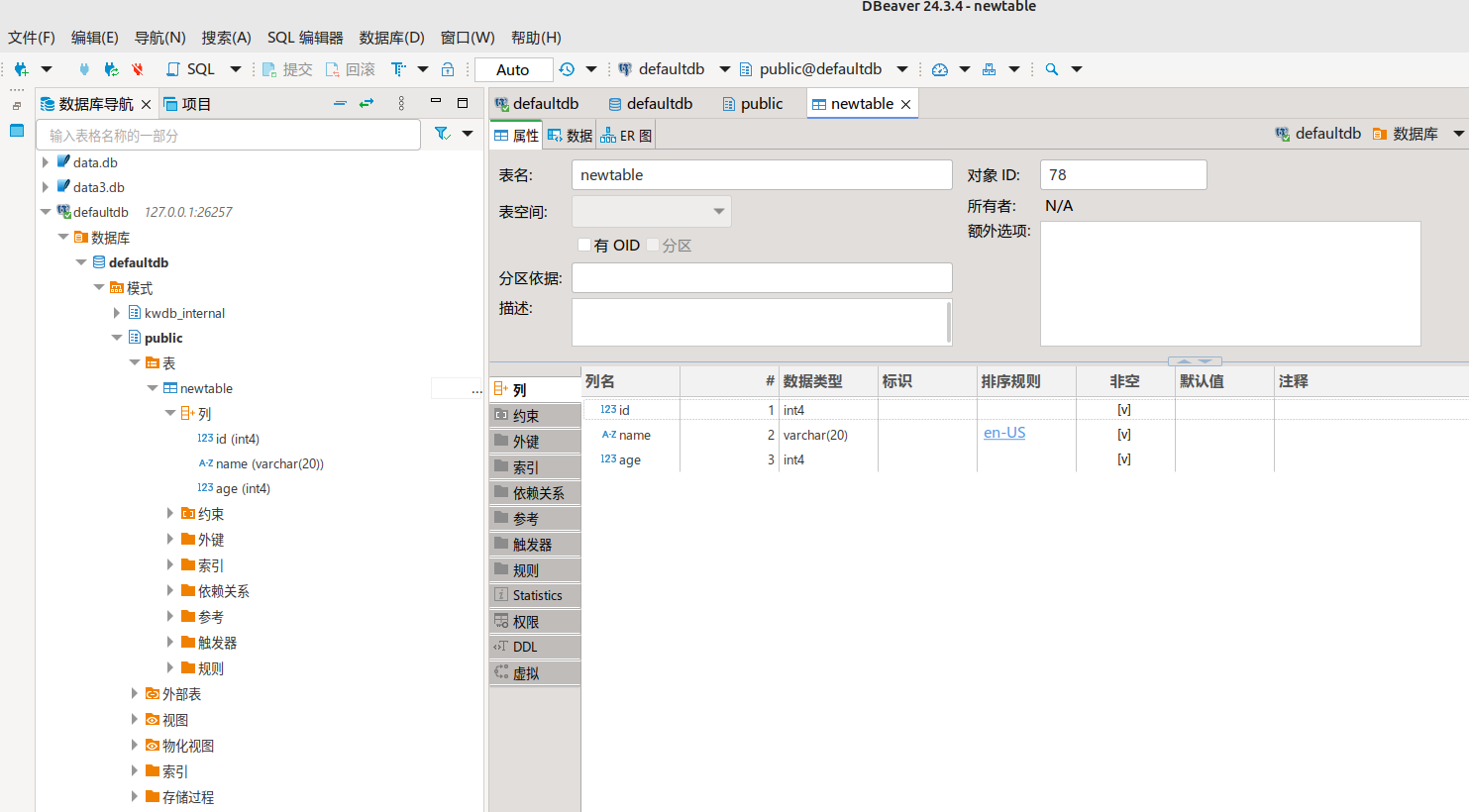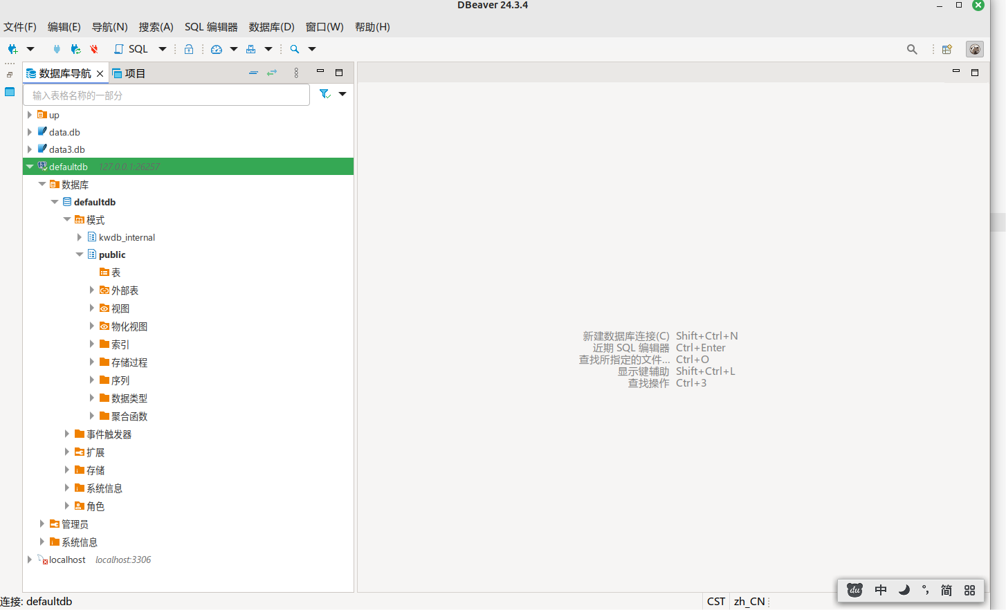 注意,上面的docker安装使用的事非安全模式,所以是没有密码的,数据库的端口为26257,使用pg协议,所以在使用 dbeaver 连接的时候,可以直接使用postgre数据库类型进行连接。PS:当然了,kwdb也提供了连接工具,因为我个人电脑里面已经有了dbeaver了,直接使用就行。如果你喜欢navicat 也可以直接使用navicat进行连接,就不做多的解释了。