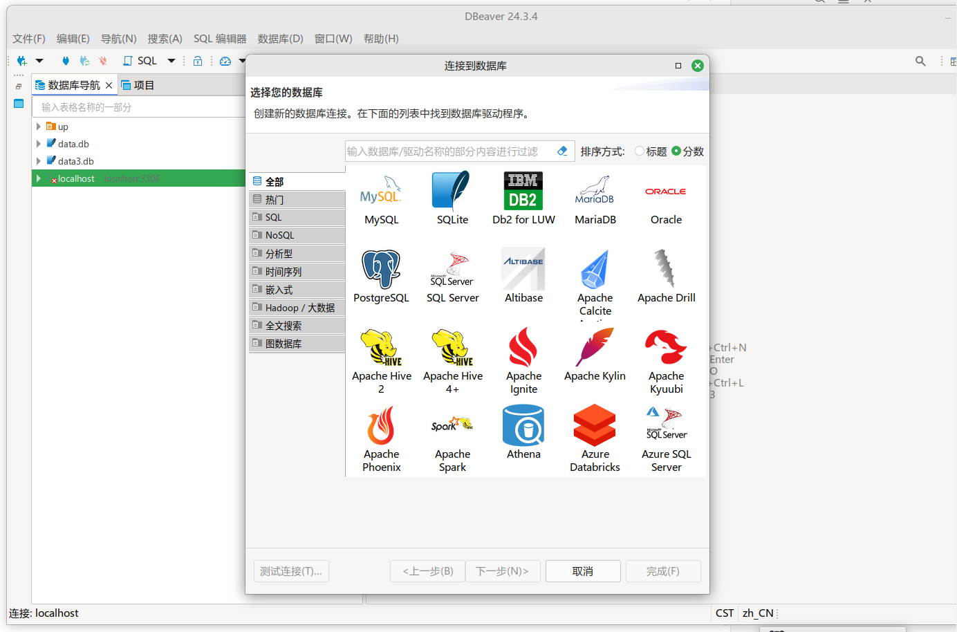 首先打开dbeaver,选择postgreSQL连接数据类型。