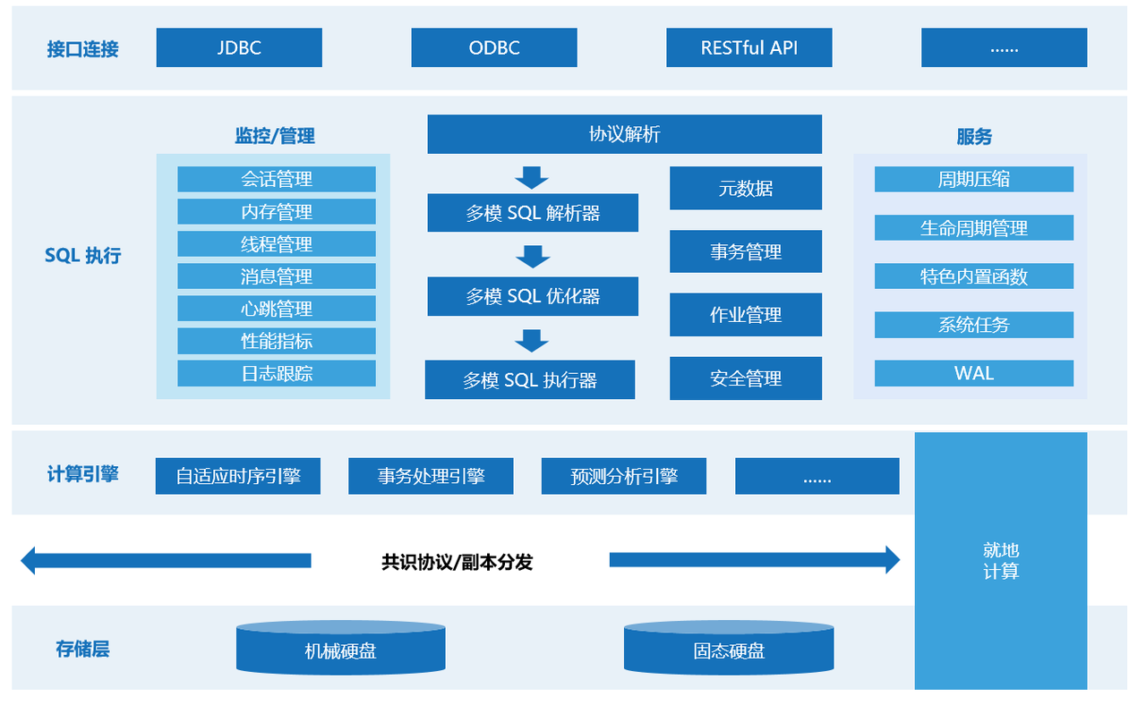 - 数据存储:采用行列混存架构,支持固态硬盘、机械硬盘等各类存储设备。