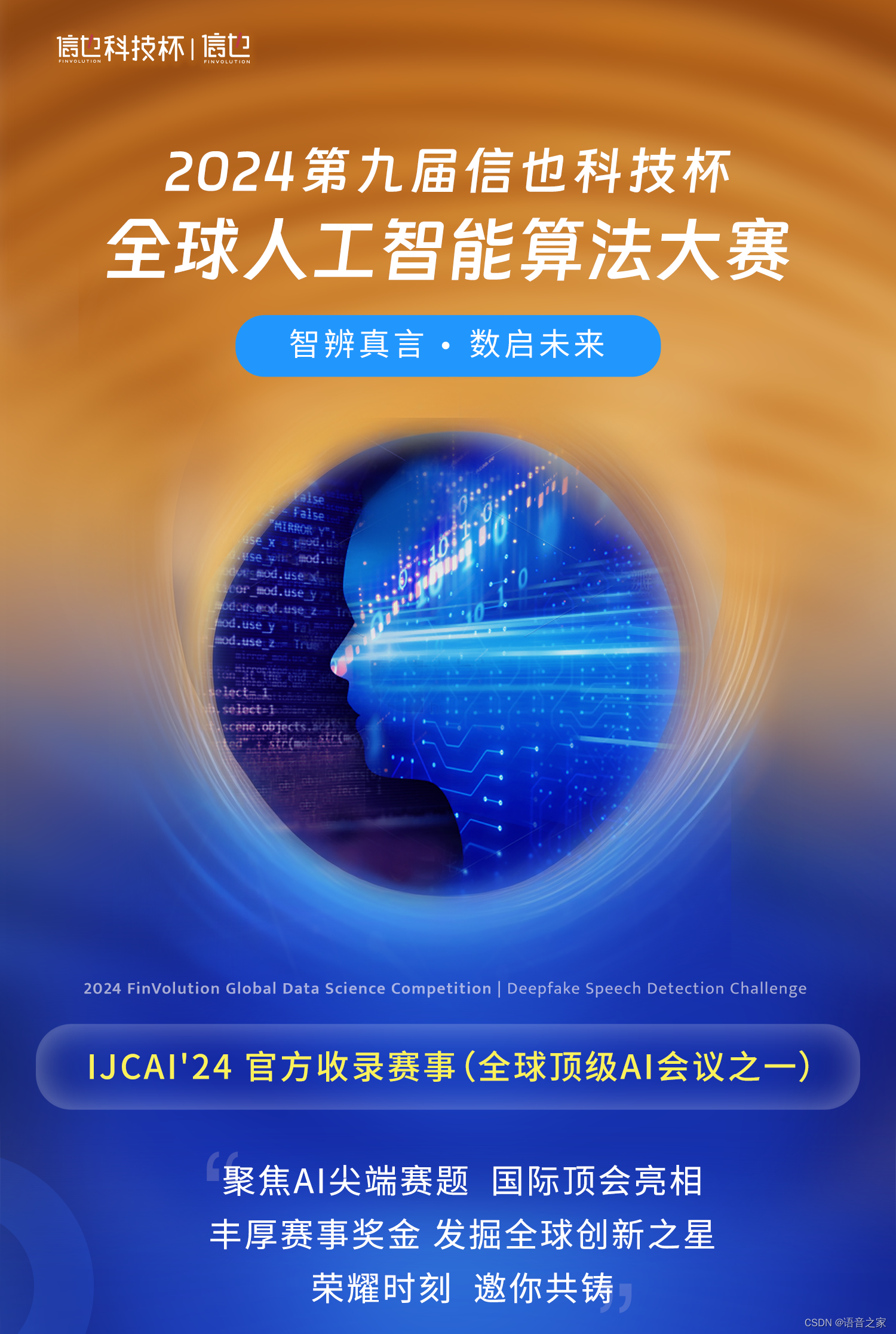 奖金31万!第九届信也科技杯全球AI算法大赛开始报名啦!报名时间5月10日—6月3日,聚焦于语音深度鉴伪识别领域,旨在激发全球算法爱好者和专家的创新潜力,共同应对由人工智能技术发展带来的挑战。期待你的参与!