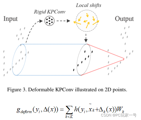 三、文章开头也提到了这篇文章的一个贡献是提出了一个可变形的KPConv,作者刚开始想着对于每一层都使用不同的Kernel Points,但是这种方法会降低网络的表述能力,刚性的KPConv中的内点是不动的,特别是给定一个特别大的K来足够覆盖核的球域时,核函数g对于x是可微的,意味着它们是可学习的,所以原作者为了更加适应点云学习,给每个卷积位置生成一组Local shifts,用于执行更复杂的任务。